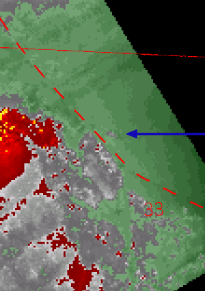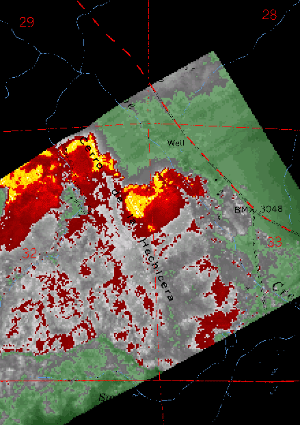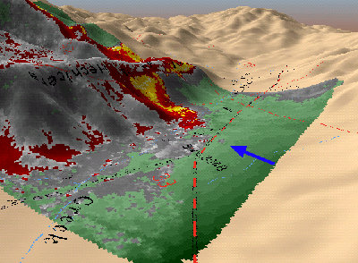 Blue arrow shows hotspot after the fire jumps the highway. |