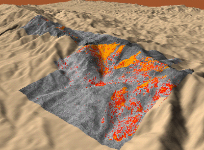 Topographic view from SE of above image, with the hotter areas colored red-orange |