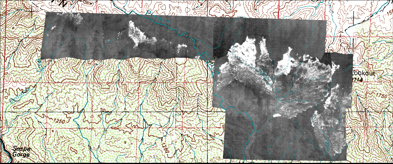 Light gray tones are areas of ash warmed by solar heating. Dark gray tones are unburned vegetation. |