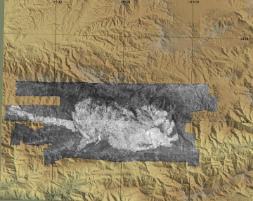 Light gray tones are areas of ash warmed by solar heating. Dark gray tones are unburned vegetation. Red, orange, and yellow regions are residual burning. Latitude and longitude of hot spots may be obtained by opening the TIFF file in a suitable viewer such as Erdas Imagine. Postfire ash-surface temperatures may be indicative of the severity of burning. |