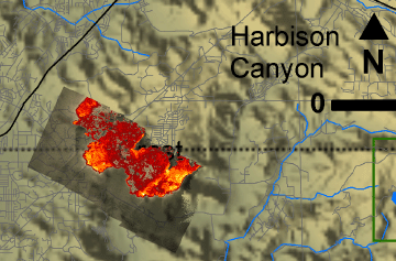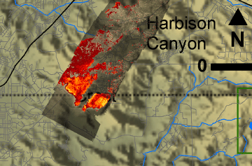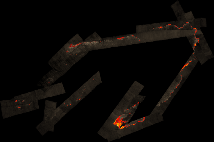 Plan view of fire. Warmer tones represent recent or active combustion; areas of light gray are cooling ash or warm bare ground and the low temperatures of unburned forest and cool ground are shown in darker gray (see chart above).