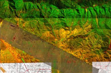 Images were collected from the PSW Airborne Sciences Aircraft and disseminated in part by satellite communications in near-real time. FireMapper measures the radiance of emitted thermal-infrared light, which readily penetrates smoke. False-color images shown here depict the apparent surface temperature (in Celsius) as estimated from radiance and a simple black-body model. Warmer tones represent recent or active combustion; areas of gray are cooling ash or warm bare ground (see chart below). Low temperatures of unburned forest and cool ground are shown in green. Images have been geographically referenced. Vertical exaggeration in 3-d views is 1.5 to one unless otherwise noted. |