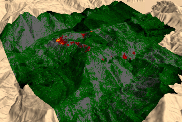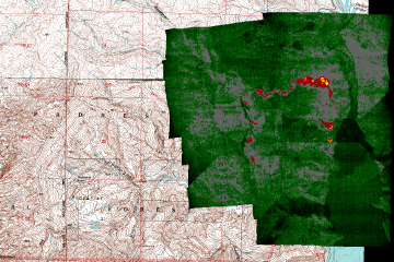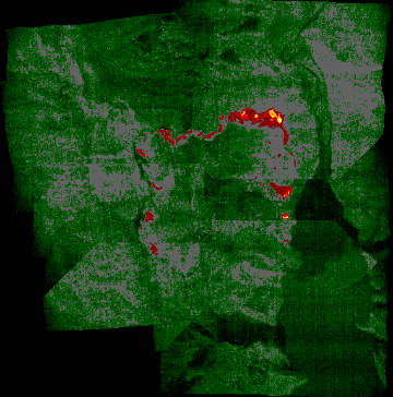 of unburned forest and cool ground are shown in green.