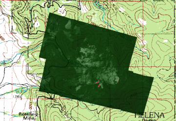 of unburned forest and cool ground are shown in green.