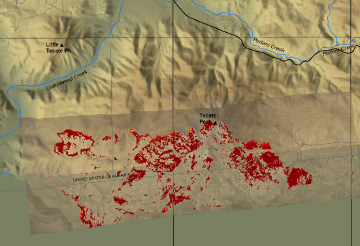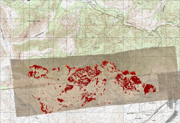 These images depict approximate fireline locations in color-coded pixels of apparent ground surface temperatures in Celsius. Use the map backgrounds as a general location guide, and look for recognizable terrain features or landmarks on the imagery itself for relative positioning of hotspots. Bodies of water, street grids, open fields, highways, ridgelines and stream courses show up well in this imagery.