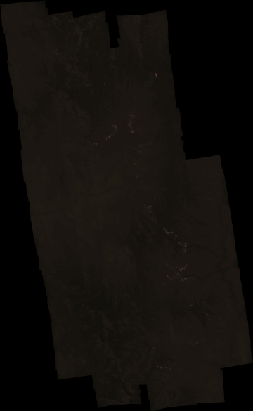 Plan view of fire. Warmer tones represent recent or active combustion; areas of light gray are cooling ash or warm bare ground and the low temperatures of unburned forest and cool ground are shown in darker gray (see chart above).