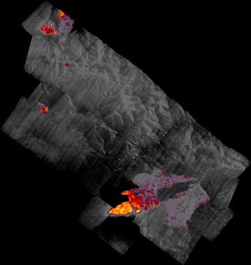 Plan view of fire. Warmer tones represent recent or active combustion; areas of light gray are cooling ash or warm bare ground and the low temperatures of unburned forest and cool ground are shown in darker gray (see chart above).