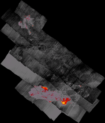 Plan view of fire. Warmer tones represent recent or active combustion; areas of light gray are cooling ash or warm bare ground and the low temperatures of unburned forest and cool ground are shown in darker gray (see chart above).