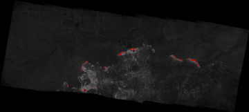 Plan view of fire. Warmer tones represent recent or active combustion; areas of light gray are cooling ash or warm bare ground and the low temperatures of unburned forest and cool ground are shown in darker gray (see chart above).