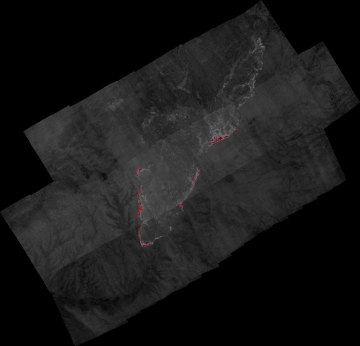 Plan view of fire. Warmer tones represent recent or active combustion; areas of light gray are cooling ash or warm bare ground and the low temperatures of unburned forest and cool ground are shown in darker gray (see chart above).