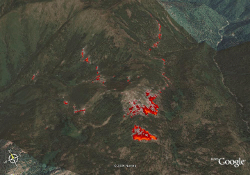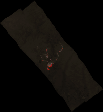 Purple is used to show very warm ground that may or may not be fire-related. Purple pixels immediately adjacent to red pixels can be interpreted to be cooling ash; purple pixels far from any red pixels may be interpreted as solar heating on bare rock.