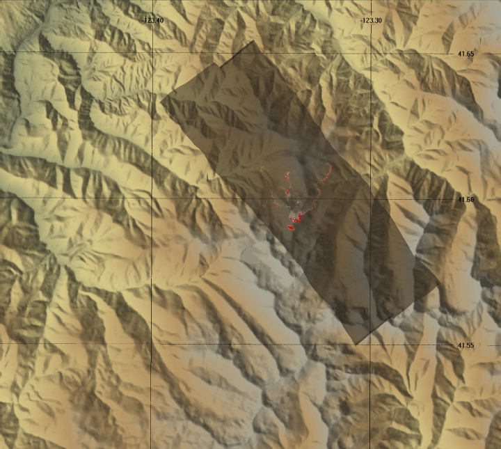 Plan view of fire. Warmer tones represent recent or active combustion; areas of light gray are cooling ash or warm bare ground and the low temperatures of unburned forest and cool ground are shown in darker gray (see chart above).