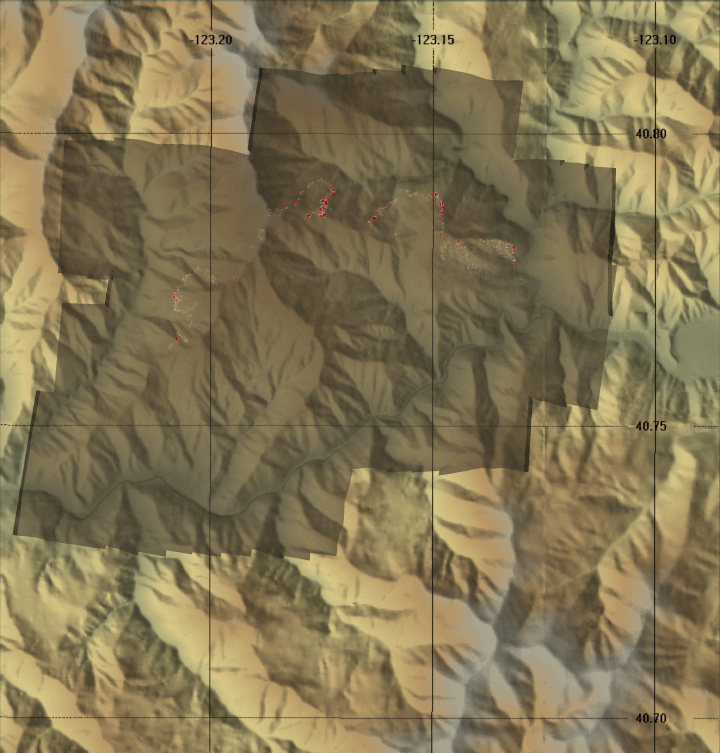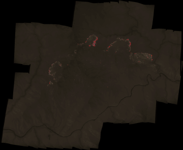 Plan view of fire. Warmer tones represent recent or active combustion; areas of light gray are cooling ash or warm bare ground and the low temperatures of unburned forest and cool ground are shown in darker gray (see chart above).