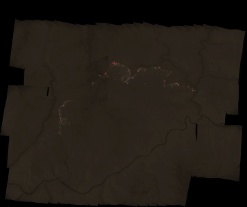 Plan view of fire. Warmer tones represent recent or active combustion; areas of light gray are cooling ash or warm bare ground and the low temperatures of unburned forest and cool ground are shown in darker gray (see chart above).