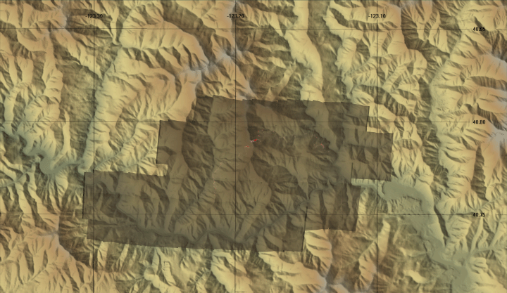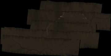 Plan view of fire. Warmer tones represent recent or active combustion; areas of light gray are cooling ash or warm bare ground and the low temperatures of unburned forest and cool ground are shown in darker gray (see chart above).