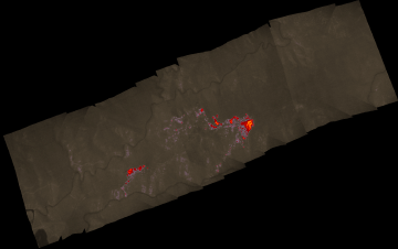 Plan view of fire. Warmer tones represent recent or active combustion; areas of light gray are cooling ash or warm bare ground and the low temperatures of unburned forest and cool ground are shown in darker gray (see chart above).