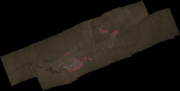 Plan view of fire. Warmer tones represent recent or active combustion; areas of light gray are cooling ash or warm bare ground and the low temperatures of unburned forest and cool ground are shown in darker gray (see chart above).