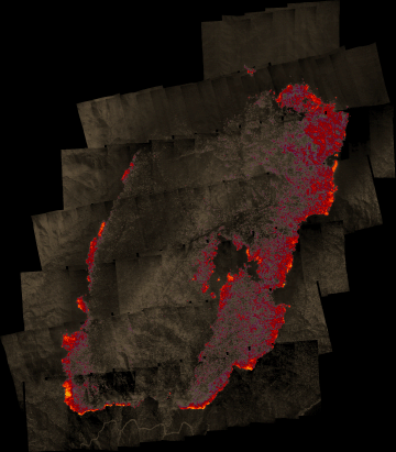 Plan view of fire. Warmer tones represent recent or active combustion; areas of light gray are cooling ash or warm bare ground and the low temperatures of unburned forest and cool ground are shown in darker gray (see chart above).