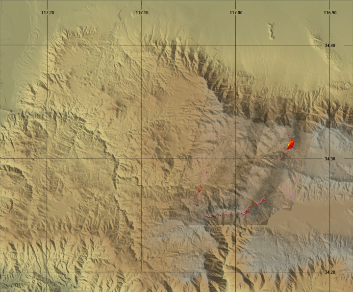 Ground surface temperatures as viewed from above at 11.9 micrometers wavelength on 16 September 2007, between 14:03 and 14:44 PDT.