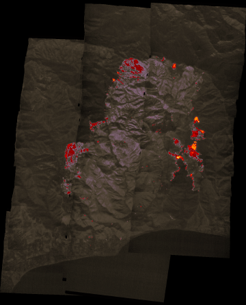 Plan view of fire. Warmer tones represent recent or active combustion; areas of light gray are cooling ash or warm bare ground and the low temperatures of unburned forest and cool ground are shown in darker gray (see chart above).