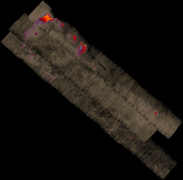 Plan view of fire. Warmer tones represent recent or active combustion; areas of light gray are cooling ash or warm bare ground and the low temperatures of unburned forest and cool ground are shown in darker gray (see chart above).