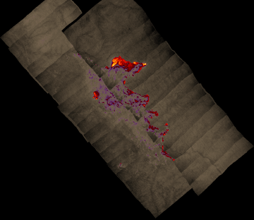 Plan view of fire. Warmer tones represent recent or active combustion; areas of light gray are cooling ash or warm bare ground and the low temperatures of unburned forest and cool ground are shown in darker gray (see chart above).