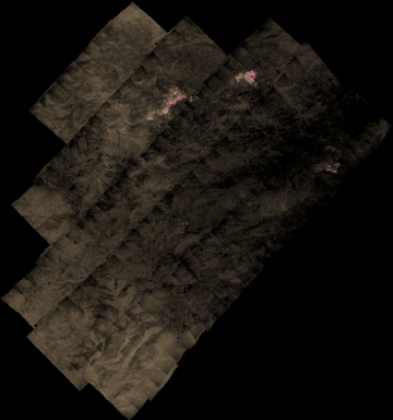 Plan view of fire. Warmer tones represent recent or active combustion; areas of light gray are cooling ash or warm bare ground and the low temperatures of unburned forest and cool ground are shown in darker gray (see chart above).