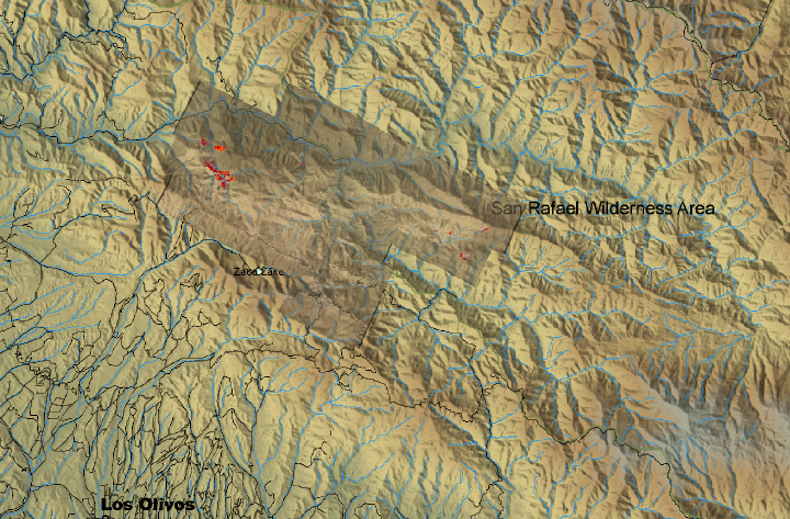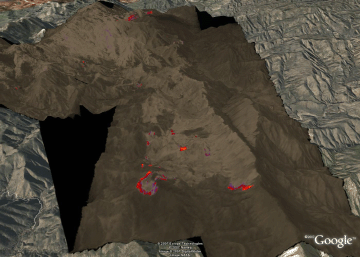 Purple is used to show very warm ground that may or may not be fire-related. Purple pixels immediately adjacent to red pixels can be interpreted to be cooling ash; purple pixels far from any red pixels may be interpreted as solar heating on bare rock.