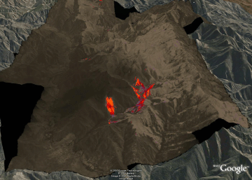 Plan view of fire. Warmer tones represent recent or active combustion; areas of light gray are cooling ash or warm bare ground and the low temperatures of unburned forest and cool ground are shown in darker gray (see chart above).