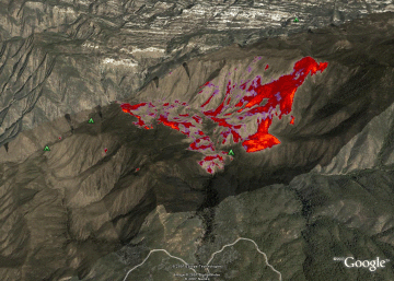 Purple is used to show very warm ground that may or may not be fire-related. Purple pixels immediately adjacent to red pixels can be interpreted to be cooling ash; purple pixels far from any red pixels may be interpreted as solar heating on bare rock.