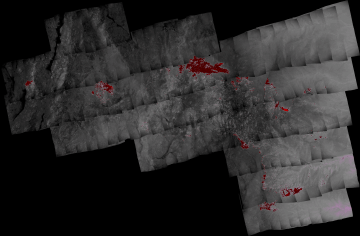 Plan view of fire. Warmer tones represent recent or active combustion; areas of light gray are cooling ash or warm bare ground and the low temperatures of unburned forest and cool ground are shown in darker gray (see chart above).