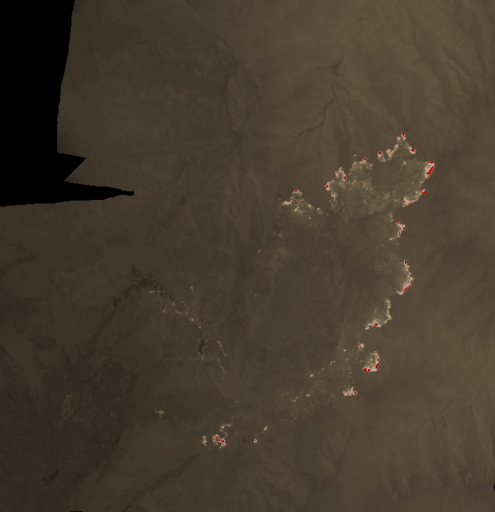 Plan view of fire. Warmer tones (red, orange, yellow) represent recent or active combustion; areas of light gray are cooling ash or warm bare ground and the low temperatures of unburned forest and cool ground are shown in darker gray (see chart above). |