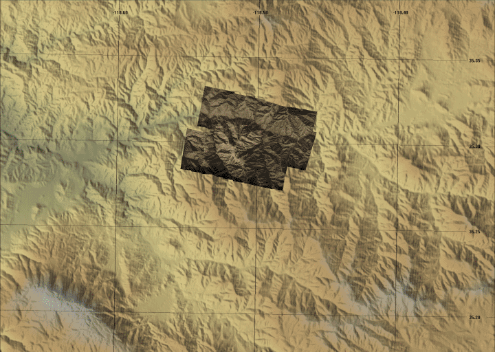 Ground surface temperatures as viewed from above at 8-12 micrometers wavelength in the thermal infrared. |