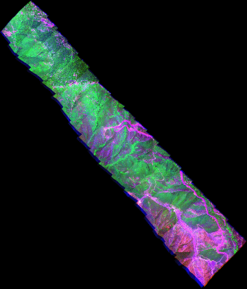 (This RGB image shows reflected red light at 650 nm in red, reflected NIR at 850 nm in green, and thermal IR at 10.5 um in blue.) |