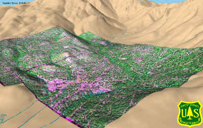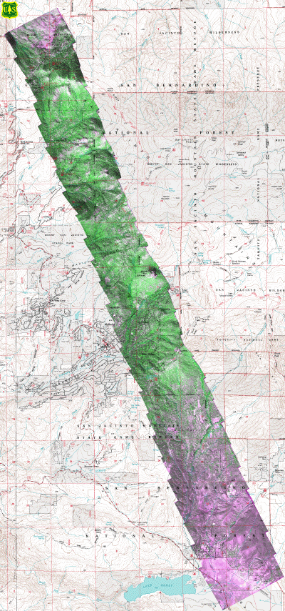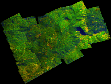 (This RGB image shows reflected red light at 650 nm in red, reflected NIR at 850 nm in green, and thermal IR at 10.5 um in blue. The blue band has been inverted, so that the colder areas are brighter blue.)