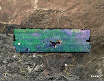 Healthy vegetation is bright green; stressed or dying vegetation is orange-brown in this false-color depiction.
