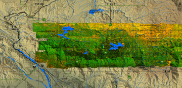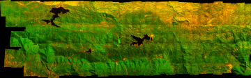 (This RGB image shows reflected red light at 650 nm in red, reflected NIR at 850 nm in green, and thermal IR at 10.5 um in blue. The blue band has been inverted, so that the colder areas are brighter blue.)