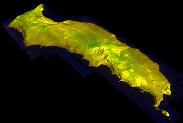 View from the southwest of the Island's west coast, with imagery draped over the elevation. DEM used for registration and topography was derived from FireMapper stereo imagery.